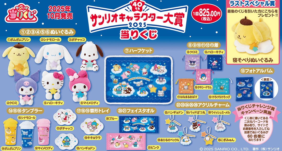 三麗鷗粉絲準備尖叫啦!官方推出2025年《三麗鷗角色大賞》,人氣角色們全員登場,療癒感滿滿!這次全明星角色一次集結,從布丁狗、大耳狗、帕恰狗到酷洛米、Hello Kitty與美樂蒂,全都變成超可愛的絨毛玩偶,抱著星星登場!還有星空圖案的半身毯、雲形托盤、角色圖樣的環保隨行杯與毛巾,實用又可愛。更有多款收納小袋與壓克力吊飾,讓你隨時隨地帶著喜愛的角色同行!最後賞是「布丁狗睡姿絨毛玩偶」,超軟萌造型令人融化。整體設計以星夜色調包裝,滿滿紀念感,是三麗鷗迷絕不能錯過的年度收藏重點!