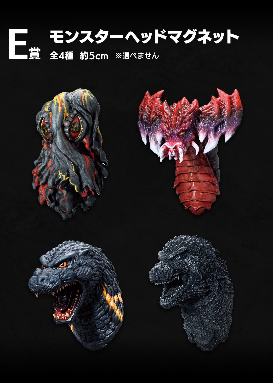 E 賞則再次推出了大人氣的怪獸頭雕磁鐵,這次收錄黑多拉、戴斯特洛伊亞的集合體、紅蓮哥吉拉以及正宗哥四種款式!隨機發一種。